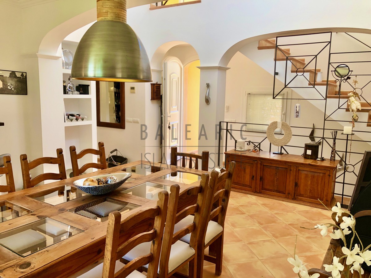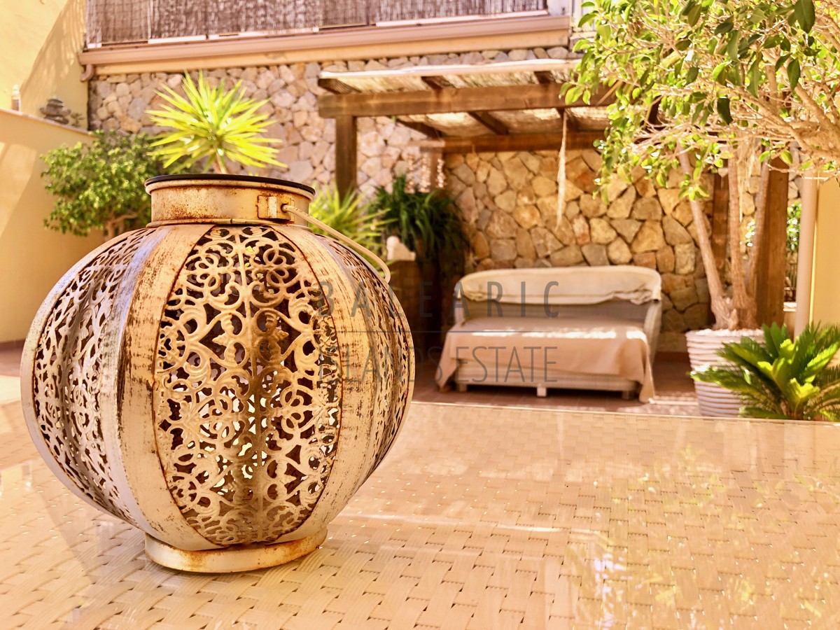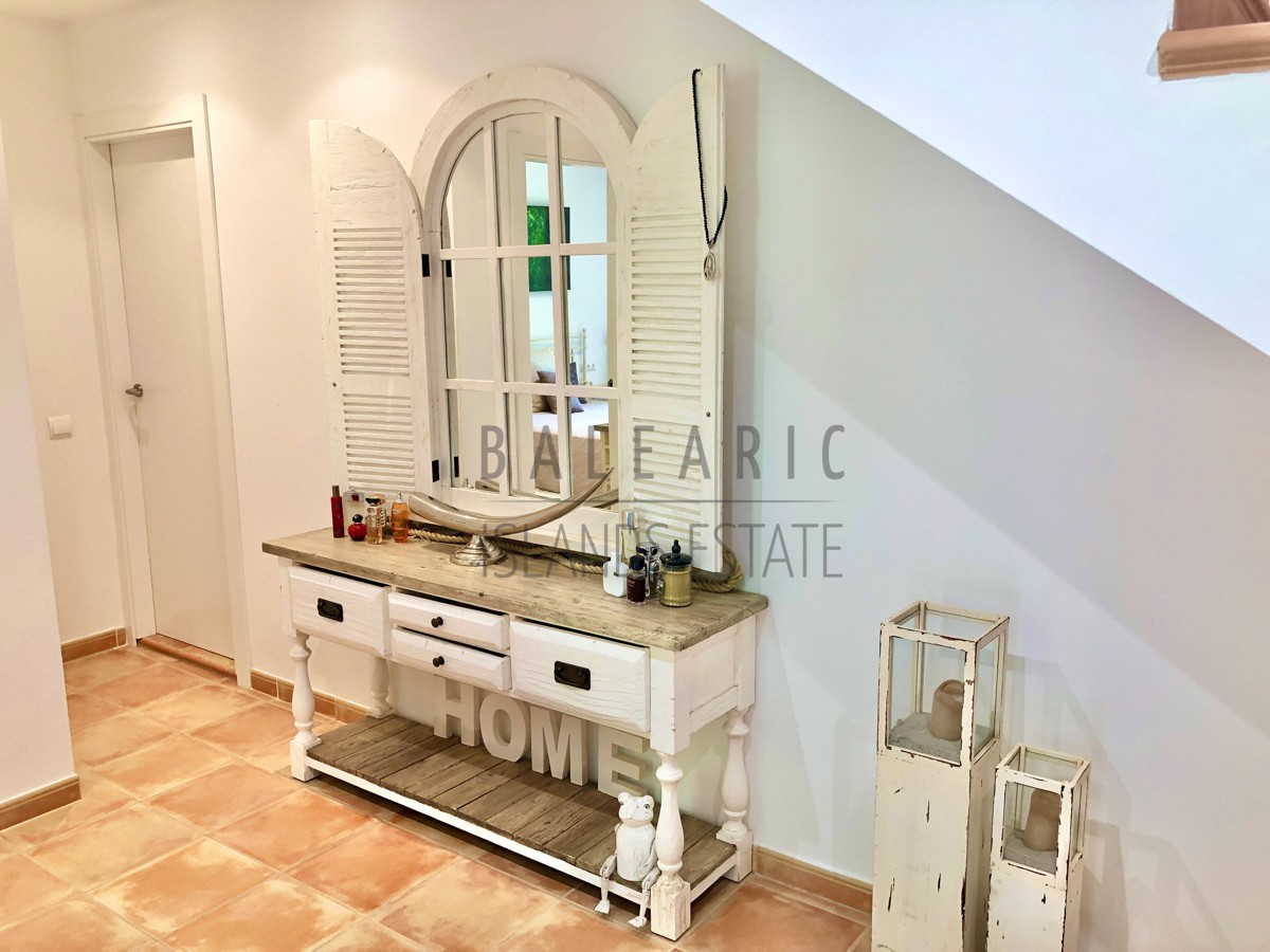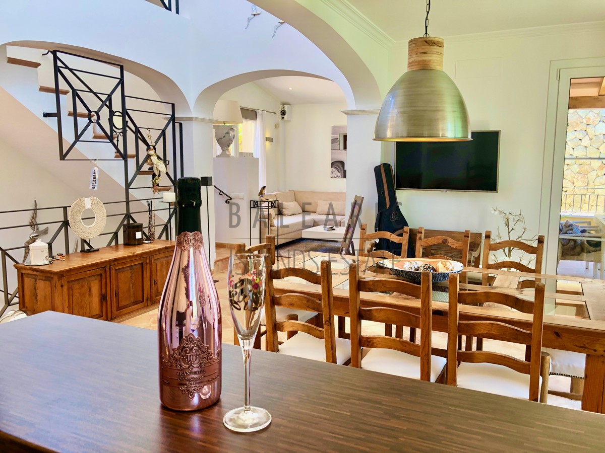 Durch einen herrlichen Patio führt der Weg über den Eingang im ersten Obergeschoss des Hauses und in den charmanten Wohn/Essbereich mit teilweise doppelter Deckenhöhe und einem direkten Zugang auf eine idyllische Terrasse mit schönem Blick in die Fauna der Umgebung von Camp de Mar.