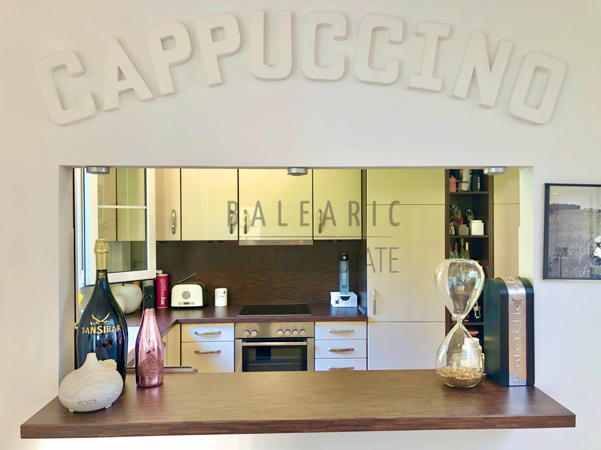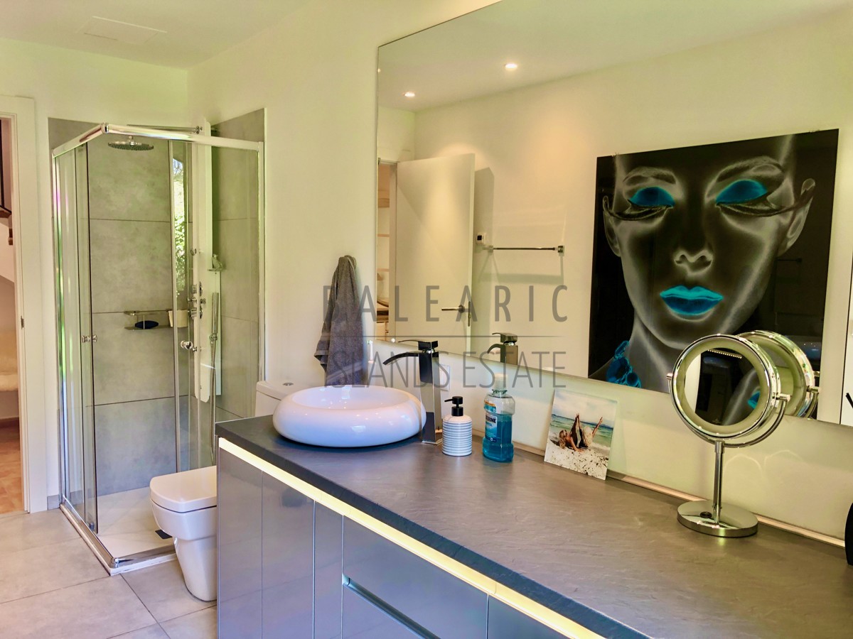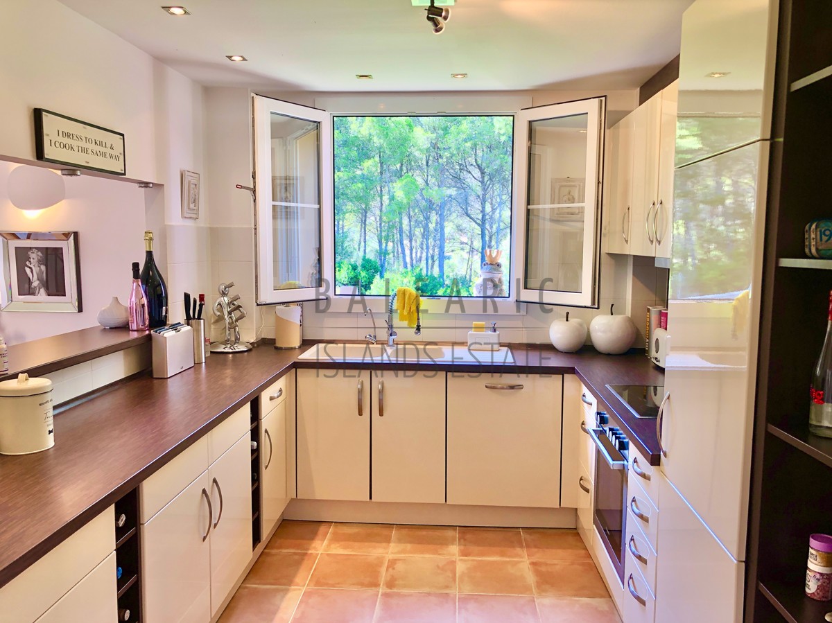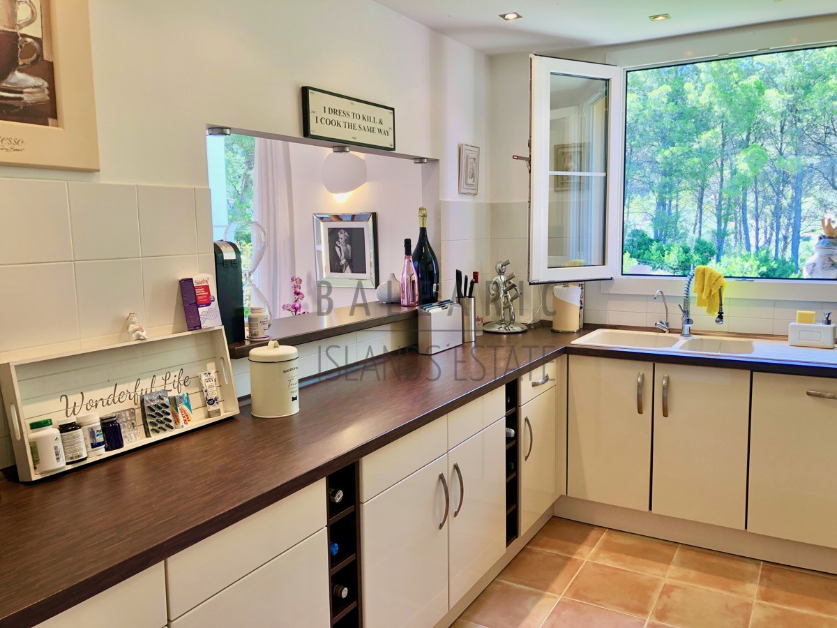 Durch einen herrlichen Patio führt der Weg über den Eingang im ersten Obergeschoss des Hauses und in den charmanten Wohn/Essbereich mit teilweise doppelter Deckenhöhe und einem direkten Zugang auf eine idyllische Terrasse mit schönem Blick in die Fauna der Umgebung von Camp de Mar.
